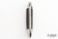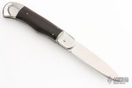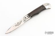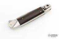 This Leverlock auto by Medteh Knives features a mirror finished blade. The handle is comprised of stainless steel bolsters and pommel with wood scales over steel liners and backspacer. Strong and fast action. Has some light scratches, otherwise excellent condition.