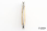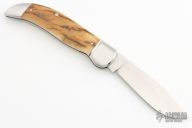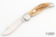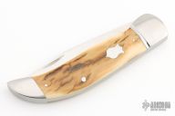 This slipjoint by Bobby Toole features a hand rub satin finished blade with nail nick. The handle has fluted stainless steel bolsters, mammoth ivory covers with stainless steel escutcheon, stainless steel liners and spring. Has half stop, flush in all positions. Has a few light scratches, otherwise excellent condition. Comes with a zippered case.