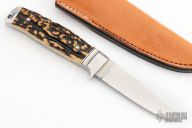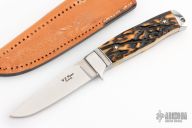 This Integral hunter by WD Pease features a mirror finished blade with fileworked spine, .173" blade stock and .794" blade depth, full integral tang construction. The handle has integral bolsters with stag scales and mosaic pins. Comes with a brown leather sheath with boot clip and a zippered case. Excellent condition. "Pbc3" on blade.