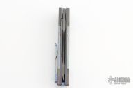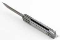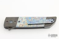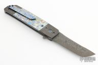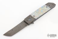 This Full Dress Hamachi Framelock Flipper by Pohan Leu has a Damascus tanto blade with swedge and flipper. Handle has a zirconium bolsters, timascus scales, floating timascus backspacer and tip up clip, anodized titanium liners, anodized titanium hardware. Dead center blade seating, nice detent, and rock solid lockup. Rides on bearings. Beautifully made piece. Comes with a zippered case. Excellent condition. This double Bolstered Hamachi is the only double sided dress knife Pohan Leu has ever built. It is marked #1 inside.