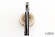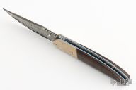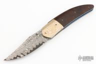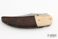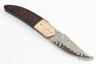 This knife by Hennie Du Plessis features a San Mai Damascus blade with notched thumbrest and single thumbstud. The handle has dovetailed mokume bolsters, nice wood scales (Tasmanian Blackwood?), Bertie Rietveld Damascus backspacer, orange peel finished and anodized titanium liners. Excellent condition. Comes with a zippered case.