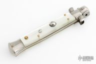 This 9" Picklock features a mirror polished blade drop point blade. The handle has stainless steel bolsters, front and rear, acrylic scales, brass liners, stainless spring. Excellent Condition.