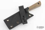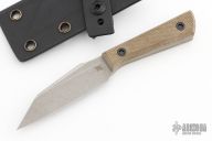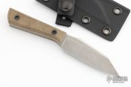 This Revenant by Knife Modders features a stonewashed blade with swedge, .107" blade stock and .829" blade depth, full tang construction. The handle has green canvas micarta scales. Comes with a kydex sheath. Excellent condition.