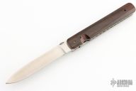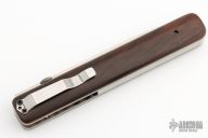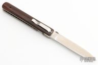 This Linerlock by Reese Weiland features a satin finished blade with a thumbdisc. The handle has cocobolo scales, stainless steel backspacer, titanium liners with jeweled interiors, tip down stainless steel clip. Nice blade seating, detent and lockup. Has a couple light scratches, otherwise excellent condition. #008