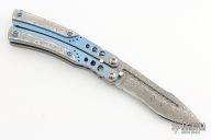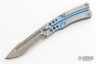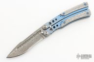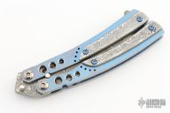 This Lambo 5 Balisong by Patrick Famin features a Damascus blade with milled fullers. The handles are two-tone anodized titanium with Damascus overlays and anodized titanium hardware, jeweled interiors. Comes with a zippered case. Excellent condition.