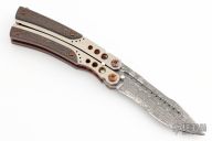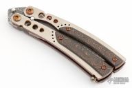 This Lambo 1 Balisong by Patrick Famin features a Damascus blade with milled fullers. The handles are two-tone anodized titanium with copper carbon fiber overlays and anodized titanium hardware, jeweled interiors. Comes with a zippered case. Excellent condition.