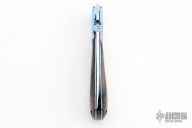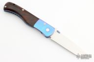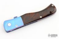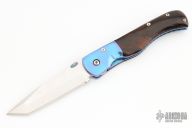 This Linerlock by Benchmade has been modified. It features a mirror polished chisel ground blade a anodized thumb disc and a notched thumb ramp.  The handle has anodized titanium liners, desert ironwood scales over jeweled and anodized titanium and an ironwood backspacer. Excellent Condition.