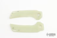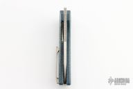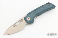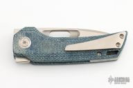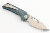 This Nymble Linerlock Flipper by EMP EDC features a stonewashed blade with notched thumbrest and flipper, and a thumbhole. The handle has blue denim micarta scales, titanium liners, backspacer and tip up clip. Comes with original box and a set of jade G-10 scales. Rides on bearings, nice detent, lockup and blade seating. Excellent condition. #007-103