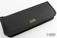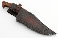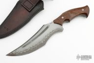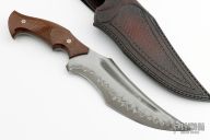 Another gorgeous piece from the Sobral Brothers! This Caiman knife features San Mai steel with false top edge, fullers, .263" blade stock and 2.035 blade depth. Full tang construction. The handle features burlap micarta scales. Comes with gorgeous custom leather sheath, and leather zipper case. New from maker!