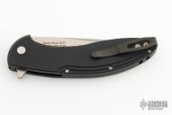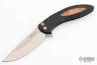 This Cambria flipper by Pro-tech features a stonewashed blade with flipper. The handle has a black aluminum frame with amboyna burl inlay in the frame and mosaic push button, tip up black deep carry stainless steel clip. Rides on bearings, nice detent, lockup and blade seating. Excellent condition. Comes with original box and papers.