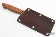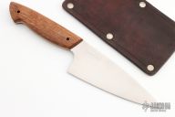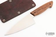 This Chef knife by Broco Knives features a hand rub satin finished 14C28N steel blade with .085" blade stock and 2.355" blade depth, full tang construction. The handle has Urunday wood scales with copper pins. Comes with a leather slip sheath and COA. New from maker!