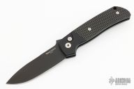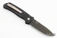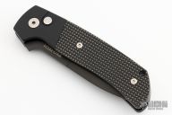 This ATCF Auto by Pro-Tech features a black Magnacut blade with notched thumbrest. The handle has a black aluminum frame with G10 scales, tip up milled titanium clip with hidden screws.  Pearl inlaid push button. Comes with original box and papers. Excellent condition.