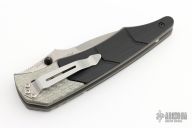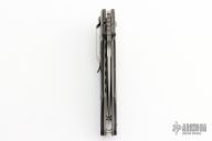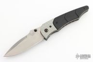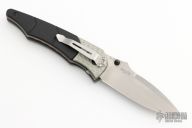 This Snody Design Gravitator folder from Benchmade features a gray spear point blade with dual thumb-studs and a notched thumb-rest. The handle has silver twill bolsters and black G-10 scales, with bead blasted titanium liners and stainless steel posts. Has a stonewashed stainless steel clip. Nice detent, lockup and blade seating.  Comes with original box and papers.  Excellent Condition.