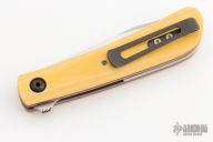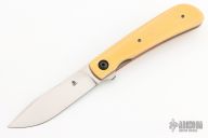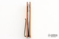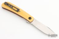 This Moose Skinner by Jason Clark features a hand rub satin finished blade with a checkered flipper. The handle has G-carta scales over red liners, bead blasted titanium liners with a titanium tip pocket clip and a floating stainless steel backspacer.  Nice detent, lockup and blade seating. Comes with a leather slip sheath, original box and COA. Excellent condition.