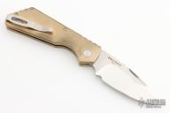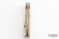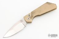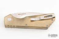 This Pro-Strider PT by Pro-Tech and Strider Knives features a Mike Irie hand ground and mirror finished blade with notched thumbrest. The handle has a tumbled aluminum bronze frame with stainless steel tip up clip. Includes the original box and papers. Has some patina, otherwise excellent condition.
