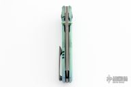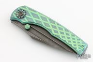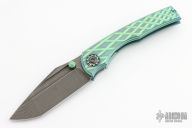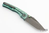 This BBM V2 by Nick Chuprin and Robert Carter features a two-tone finish blade acid-wash with satin flats and anodized titanium thumbstuds. The handle has a milled titanium (fractle) frame with tumbled and anodized finishes, zirconium pivot collars, pivot, backspacer and tip up clip with hidden screws. Rides on Skiff Made bearings, nice detent, lockup and blade seating. Comes with a zippered case and COA dated 1-28-23. Excellent condition.