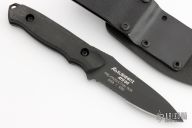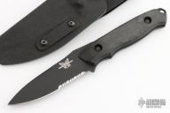 This Nimravus cub by Benchmade has a black partially serrated blade with notched thumbrest, .117" blade stock and 1.137" blade depth, full tang construction. The handle has black micarta scales with lanyard hole at the butt. Comes with a kydex sheath. Pre-Production Run 0359/1000. Excellent Condition.