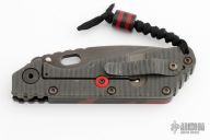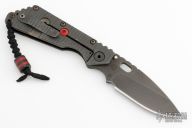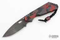 This SMF framelock folder by Mick Strider features a black drop point blade with notched thumbrest and a thumbhole. The handle has a black/red cameo aluminum and "flamed" titanium frame with matching tip up titanium clip. Includes Hinderer "Lock Bar Stabilizer" for maximum reverse lock retention. Nice detent, lockup and blade seating. 2021 CCKS Show Special. Has some scuffs and scratches, has been used and resharpened, otherwise good user condition.