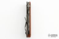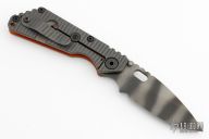 This SNG framelock folder by Mick Strider features a tiger stripe blade and a dimple pattern black/orange G-10 and flamed titanium frame and tip up titanium clip. Includes a "Lock Bar Stabilizer" for maximum reverse lock retention. Nice detent, lockup and blade seating. New condition.