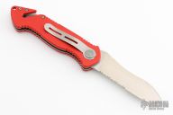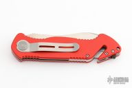 This Original PRT Rocket rescue knife by Eickhorn-Solingen features a spear point partially serrated blade with notched thumbrest. The handle has red aluminum scales with stainless steel liners, aluminum backspacer, glass breaker at butt, lanyard hole, safety cutter at the butt. Includes original box and tool. Excellent condition.