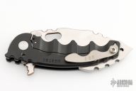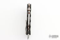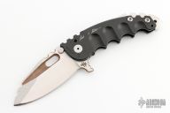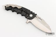 This Man of War GEN2 flipper by TS Heeter features a satin multi-ground blade with notched thumbrest, fullers, thumbhole and flipper. The handle has a black titanium frame with tip up reversible titanium clip, steel backspacer. Nice detent, lockup and blade seating. Excellent condition. Includes COA and zippered case. Dated 10-24-19. #000