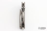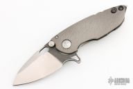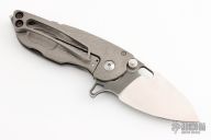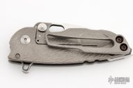 This H-Mini Flipper by Direware Custom Knives features a satin finished blade with swedge, notched thumbrest, and flipper. The handle has a hand textured titanium frame with a 440C hardened stainless steel pointed backspacer, textured and tumbled titanium tip up clip. Nice blade seating, detent and lock up, rides on washers but feels like bearings! Excellent condition.
