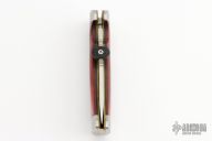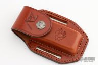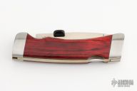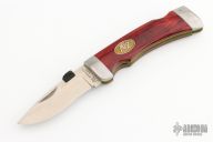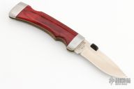 This Cheetah by Katz Knives features a satin finished drop point blade with nail nick, thumbdisc, and notched thumbrest. The handle has stainless steel boslters, front and rear, red wood scales, brass liners. Comes with brown leather belt sheath and original box. Excellent condition.