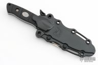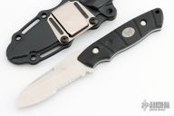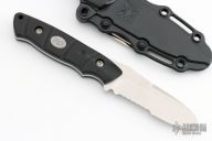 The Benchmade knife features a stonewashed sheepsfoot blade with partial serrations, a notched thumbrest and a full tang construction. .112" Blade Stock. 1.10" Blade Depth. The handle features black G-10 scales. Includes a kydex sheath and the original box. Excellent Condition.