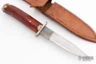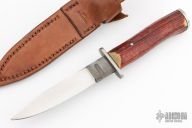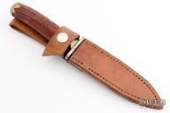 This knife by Lee McDowell features a hand rub satin finished blade with hamon made from a Nicholson File, .147" blade stock and .862" blade depth, hidden tang construction. The guard is also made from a file, stag grip, and a steel butt with the "Nicholson" file logo. Comes with a brown leather sheath. Has a few light scratches, otherwise excellent condition.