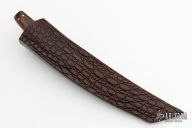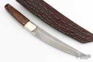 This Tanto features a Damascus tanto blade with a full tapered tang construction, .181" blade stock and 1.058" blade depth. The handle has nickel silver bolsters with brass pins and desert ironwood burl scales with nickel silver pins. Comes with a brown leather sheath. Has some scratches, otherwise excellent condition.