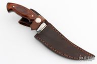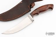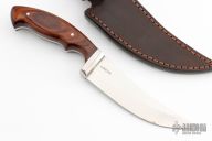 This knife by Koering features a satin finished blade with .158" blade stock and 1.369" blade depth, full tang construction. The handle has stainless steel bolsters with wood scales and brass pins. Comes with a brown leather sheath. Has a couple light scratches, otherwise excellent condition.
