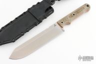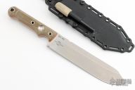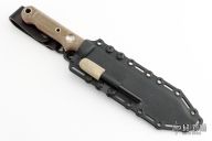 This knife by White River Knife and Tool features a tumbled blade with a notched thumbrest and a full tang construction. The handle features green canvas micarta scales over orange G10 liners. Features a polished stainless steel divot for use with a fire bow. Includes a steel striker tool and a kydex sheath. Comes with original box and papers. Excellent Condition.