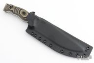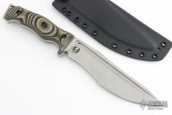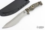 This Little Evil by Work Tuff Gear features a stonewash finished Bohler M2 Steel blade with a convex cutting edge, fullers and notched thumbrest, .265" blade stock and 1.716" blade depth, full tang construction with black/green/tan G-10 scales. Coems with a nicely fitted kydex sheath and zippered case. Excellent condition.