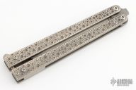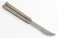 This balisong by Atropos features a stonewash finished blade. The handles are titanium with moon pattern and a T-latch. Comes with a zippered case. Has a few light scratches, otherwise excellent condition.