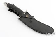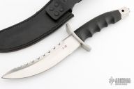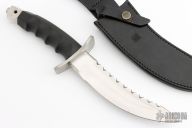 This Warrior from Al Mar Knives features a satin finished blade with serrated top edge, .233" blade stock and 1.476" blade depth, hidden tang construction. The handle has a stainless steel double guard, black rubberized handle, and a stainless steel butt. Comes with a black leather sheath. Has some scratches and patina, otherwise good condition.