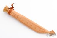 This Bushcraft knife by Karesuando Kniven features a mirror polished scandi ground blade with .147" blade stock and .989" blade depth, hidden tang construction. The handle has a brass guard with wood and reindeer antler grip. Comes with a brown leather sheath. Excellent condition.