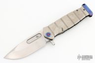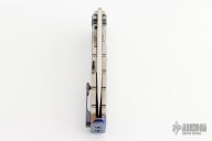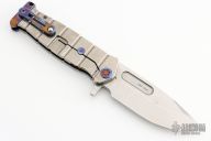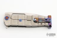 This knife features a tumbled finished drop point blade with a fuller and a notched flipper tab.  The handle features a tumbled titanium frame with anodized ascents with a matching tip up titanium clip.  Includes the original box, hard case and papers dated Sept 30, 2021. Excellent condition.
