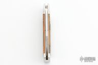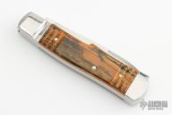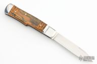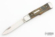 This slipjoint by Hiroaki Ohta features a hand rub satin finished blade with nail nick. The handle has polished and fluted stainless steel bolsters, fluted mammoth ivory covers with stainless steel escutcheon, stainless steel liners and spring, lanyard hole at the butt. Has half-stop, flush in all position. Has some light scratches, otherwise good condition.