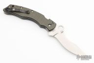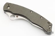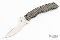 This C146CFP Szabo Folder from Spyderco features a satin finish clip point blade with swedge and thumb hole. The handle is comprised of gold line carbon fiber/G10 laminate scales over steel liners and barrel spacers. Black coated 4 way adjustable pocket clip. Lanyard tube in pommel. Excellent condition. Comes with original box and papers.