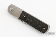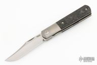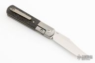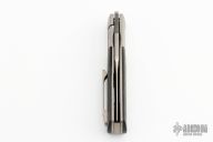 This Apache Front Flipper by Enrique Pena features a satin finished blade with a front flipper and notched thumbrest. The handle has titanium bolsters, marbled carbon fiber scales with a titanium backspacer and matching tip up pocket clip. Excellent condition. Comes with original box.