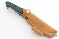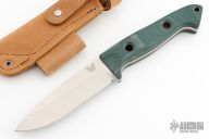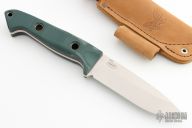 This Bushcrafter from Benchmade features a drop point tumble finished blade with .165" blade stock and 1.156" blade depth, full tang construction. The handle has a green G10 scales over red liners and full tang construction with hollow pins and a lanyard tube with lanyard. Includes leather sheath with a belt loop, original box and papers.  Excellent Condition.