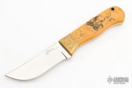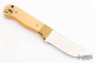 This knife by Pierce Knives features a mirror polished blade with fileworked thrumbrest, .132" blade stock and 1.068" blade depth, full tang construction. The handle has engraved brass bolsters done by Valade, yellow paper micarta scales that have scrimshaw of a big horn sheep signed "CIL '85' " Excellent condition.