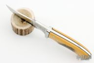 This knife by Ken Barlow features a mirror polished blade with false top edge and engraved flats, .190" blade stock and 1.012" blade depth, full tapered tang construction (mild taper). The handle has stainless steel bolsters with yellow paper micarta scales that were scrimshawed by the maker, black liners and spacers. The wolf scrimshaw was not done by Ken.  Excellent condition.