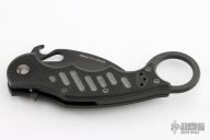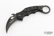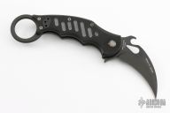 This FX-599 Karambit from Fox Knives Military Division features a black coated karambit style blade with thumb hole, wave feature and flipper. The handle has a machined black G10 scales over black steel liners and backspacer. Black coated 1-inch finger hole in pommel. Excellent condition.