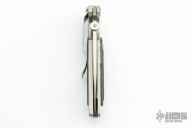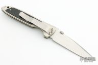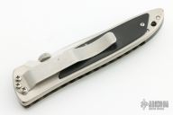 This LDC 110 by Phil Boguszewski features a hand rub satin finished blade with notched thumbrest and thumbdisc. The handle has a titanium frame with black linen micarta overlays with rubber inlays, titanium liner, jeweled interior of frame, tip down stainless steel clip. Nice detent, lockup and blade seating. Comes with a zippered case. #6. Has a few light scratches, otherwise excellent condition.