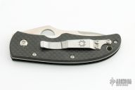 Great little linerlock designed by Michael Walker, produced by Spyderco. Satin blade and carbon fiber scales. Japan's version of the ultra-performance powderized steels dominating our knife industry today is ZDP-189. With 3-percent carbon and an epic 20-percent chromium, the hollow-ground blade becomes part of an elite fraternity of exotic blade steels just beginning to be fully utilized and appreciated by knife users. Tip up carry clip. Strong lockup; nice detent and seating. Discontinued model. Includes the original box and papers. Excellent condition.