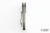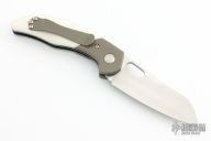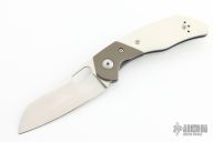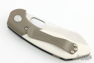 This Model 75 from Jesse Jarosz has a hand rub satin finished blade with thumbhole and notched thumbrest. Handle has blasted and anodized titanium bolsters, ivory linen micarta scales with blasted and anodized titanium liners and backspacer with lanyard pin, bead blasted and anodized tip up titanium clip, left or right reversible. Nice crisp detent, tight lockup, and centered blade seating. Comes with a COA dated 9-24-19. Excellent condition.