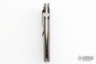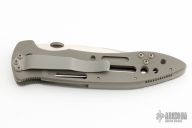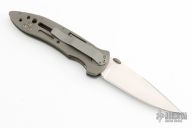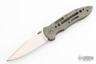 This knife by Crawford Knives features a satin finished blade with false top edge and a thumbdisc. The handle has a bead blasted titanium frame with a tip down stainless steel clip. Has some light scuffs, otherwise good condition.