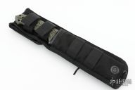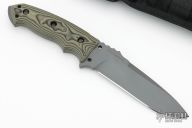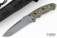 This Hogue fixed blade is an Allen Elishewitz design, it features a grey coated drop point blade with swedge and notched thumb rest, .234" blade stock and 1.413" blade depth, full tang construction. The handle has black/green, gray G10 scales over full tang construction with exposed tang glass breaker pommel. Includes nylon sheath and the original box. Excellent condition.