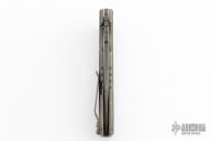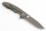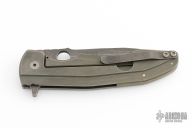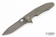 This knife is a collaboration between Dervish Knives and Zero Knives. This knife features a dark tumbled blade with a thumhole and notched flipper. The handle has tumbled titanium frame with a matching tip up pocket clip and a green G-10 backspacer.  "In Memory of Ram Maramba" is marked on the inside of the frame.  Nice detent, lock up and blade seating.  Excellent Condition.